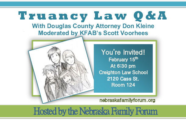 At last week’s Truancy Q&A with Douglas County Attorney Don Kleine, hosted by the Nebraska Family Forum, was told by Mr. Kleine that her experiences were due to inadequate staff and resources to deal with an overload of truancy cases last year. Whatever the reason for her daughter falling into the net meant to catch “truant” kids, she has been informed this week that her daughter will again be referred to the county attorney. (Read Martha’s Story here: http://nebraskafamilyforum.org/2012/01/myles-family-truancy-diversion-for-sick.html)